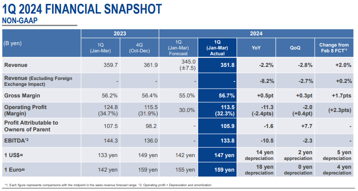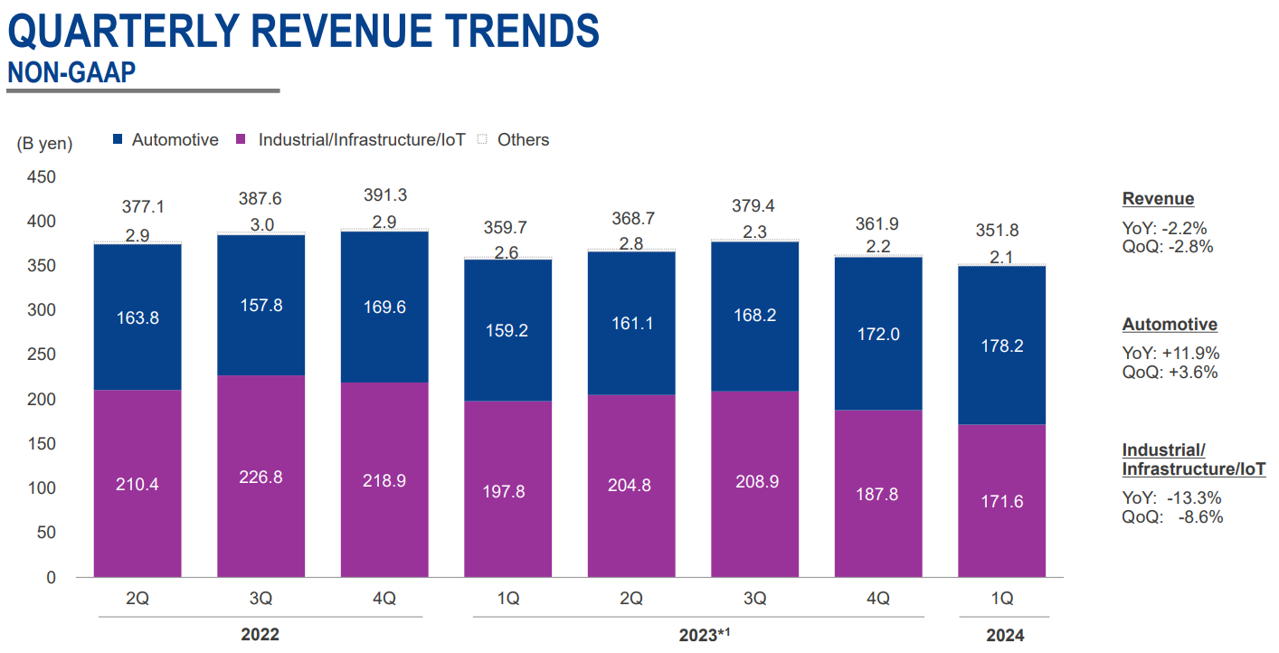 瑞萨日前公布了2024年一季度财报,非GAAP标准下,营收3597亿日元,同比降低2.2%,环比降低2.8%;运营利润1248亿日元,同比降低11.3%,环比降低2%;毛利率56.2%,同比与环比分别增长0.5和0.3个百分点。
