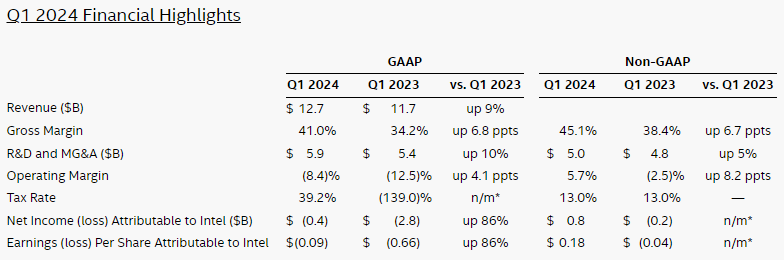英特尔日前公布了2024年一季度财报,营收127亿美元,同比增长9%;净亏损4亿美元,同比去年28亿美元的净亏损有显著改善;毛利率41.0%,同比增长6.8个百分点。